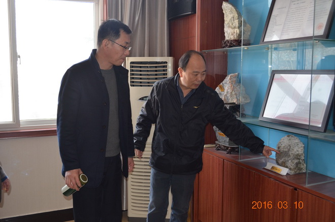 座談會結束后,劉總一行來到隊三樓會議室,興致勃勃的參觀了我隊地質樣品展臺。王隊長就我隊近年來企業文化建設情況向劉總作了介紹。